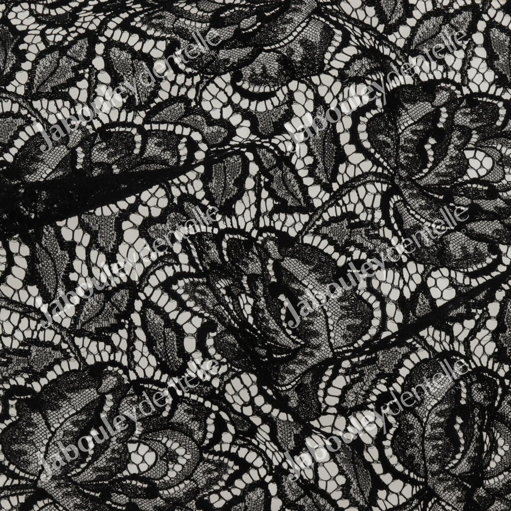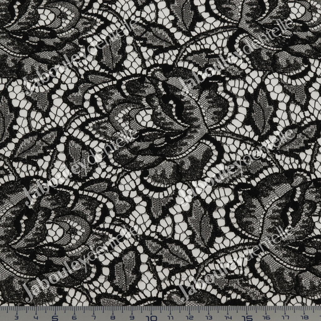 Dentelle Jacquard en laize, rigide, avec un grand motif floral sur fond de tulle craquelé.