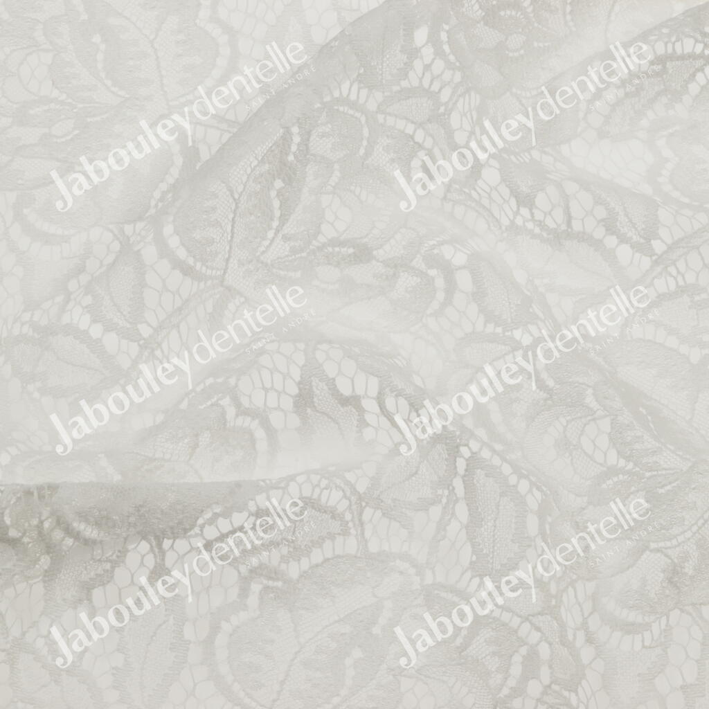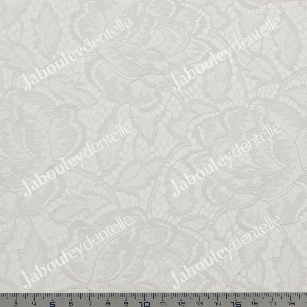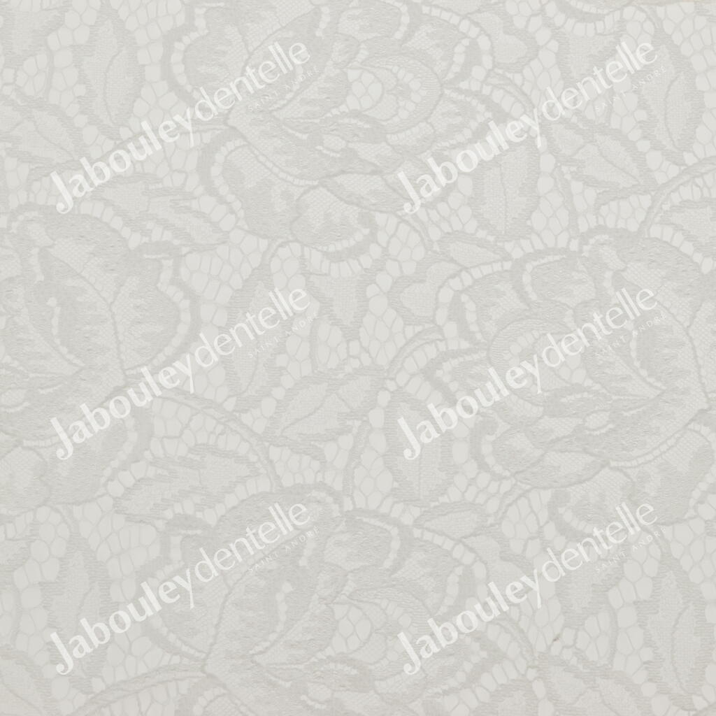 Dentelle Jacquard en laize, rigide, avec un grand motif floral sur fond de tulle craquelé.