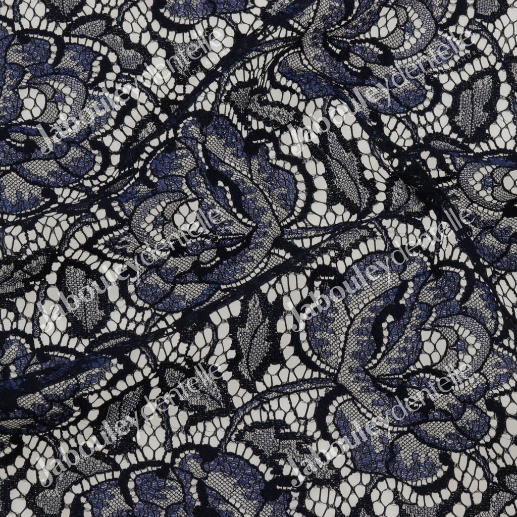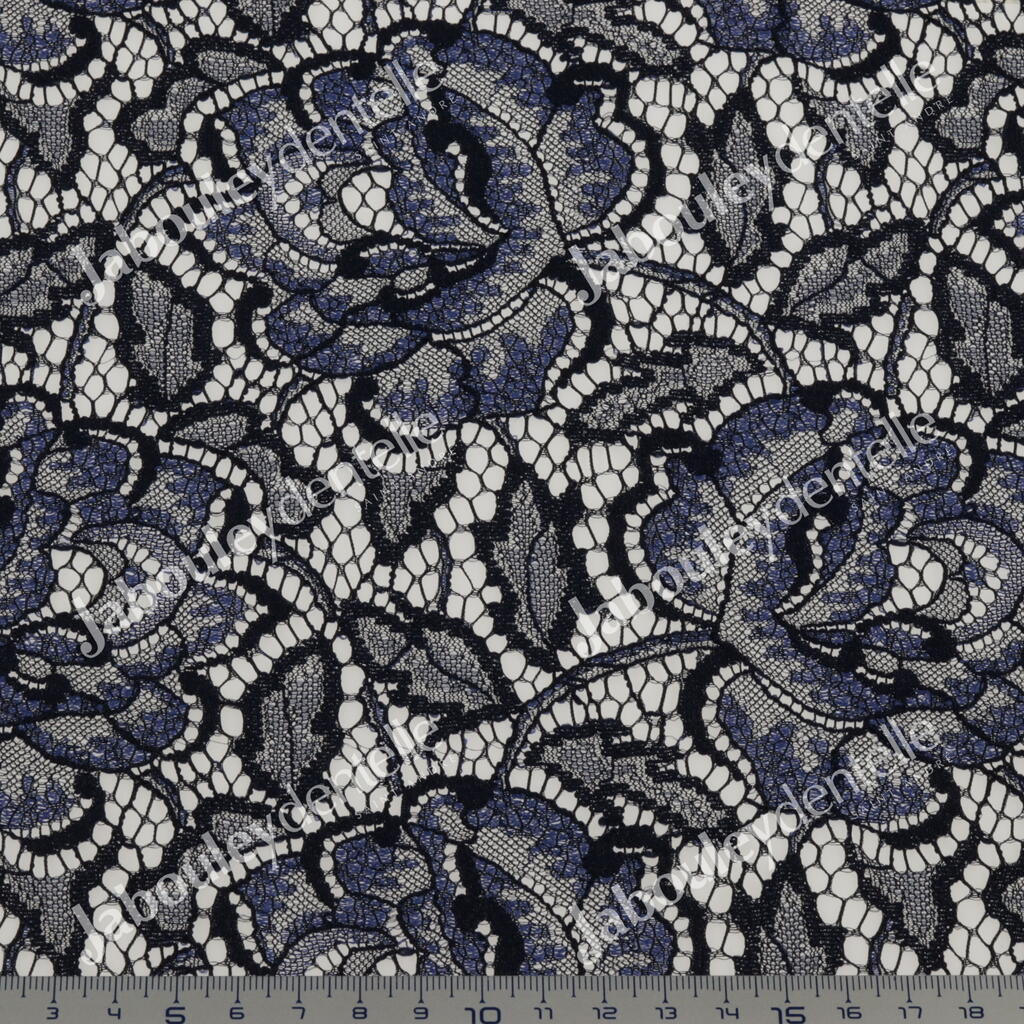 Dentelle Jacquard en laize, rigide, avec un grand motif floral sur fond de tulle craquelé.