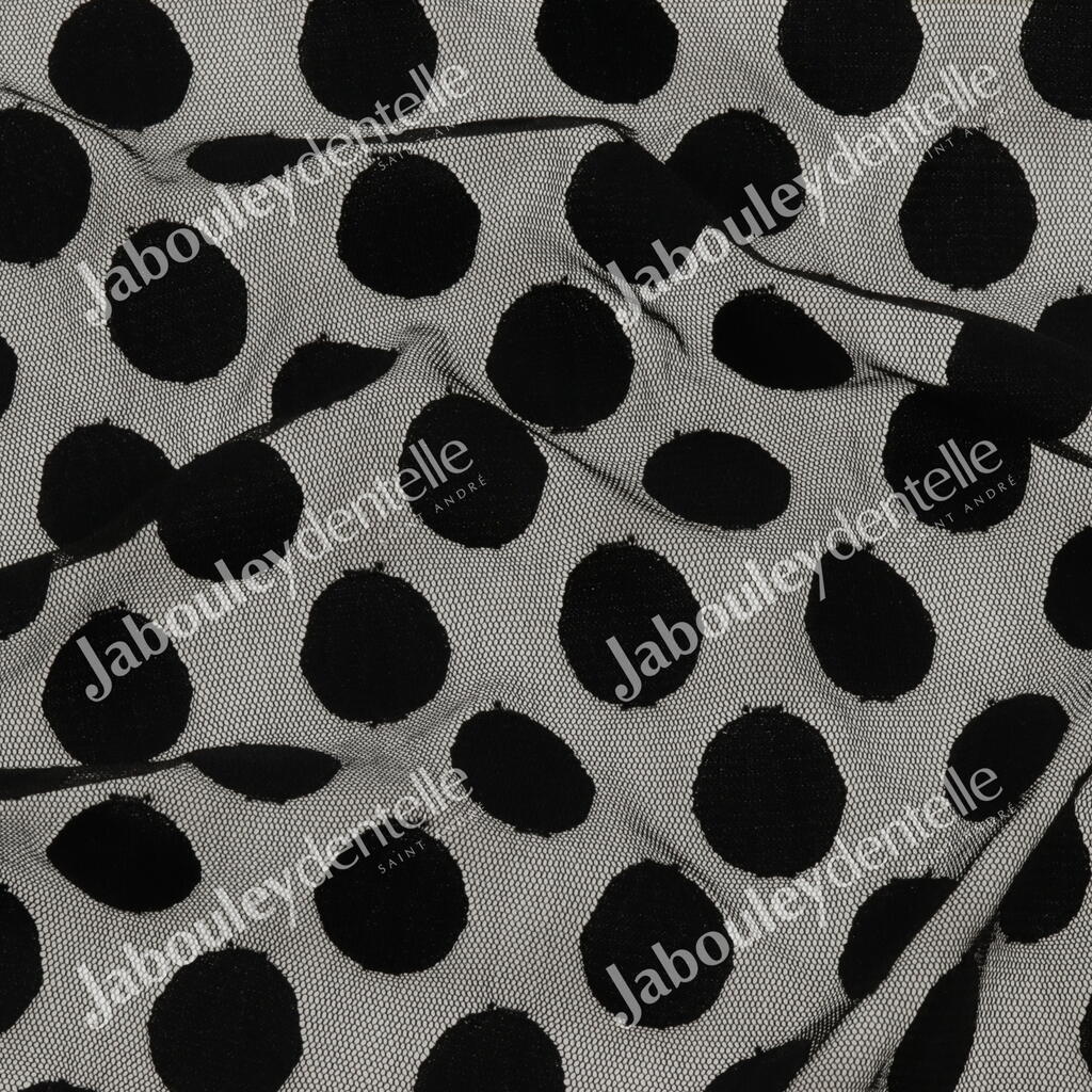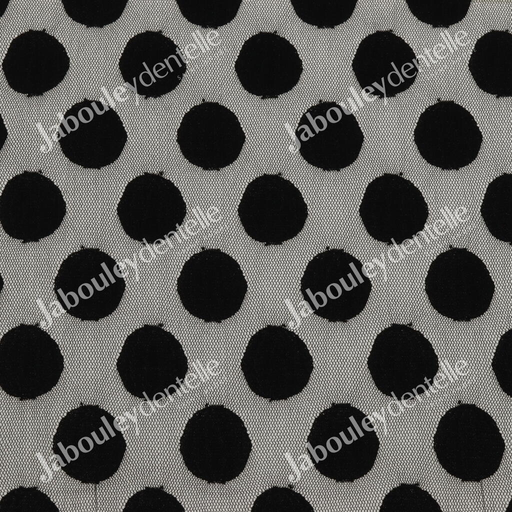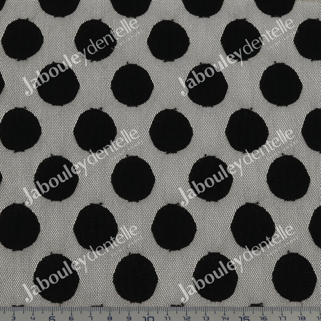 Dentelle Rachel en laize, rigide et fine, avec un joli motif de gros pois sur fond tulle.