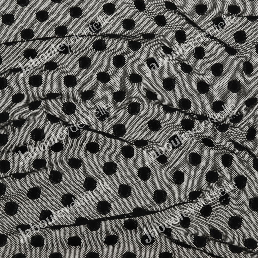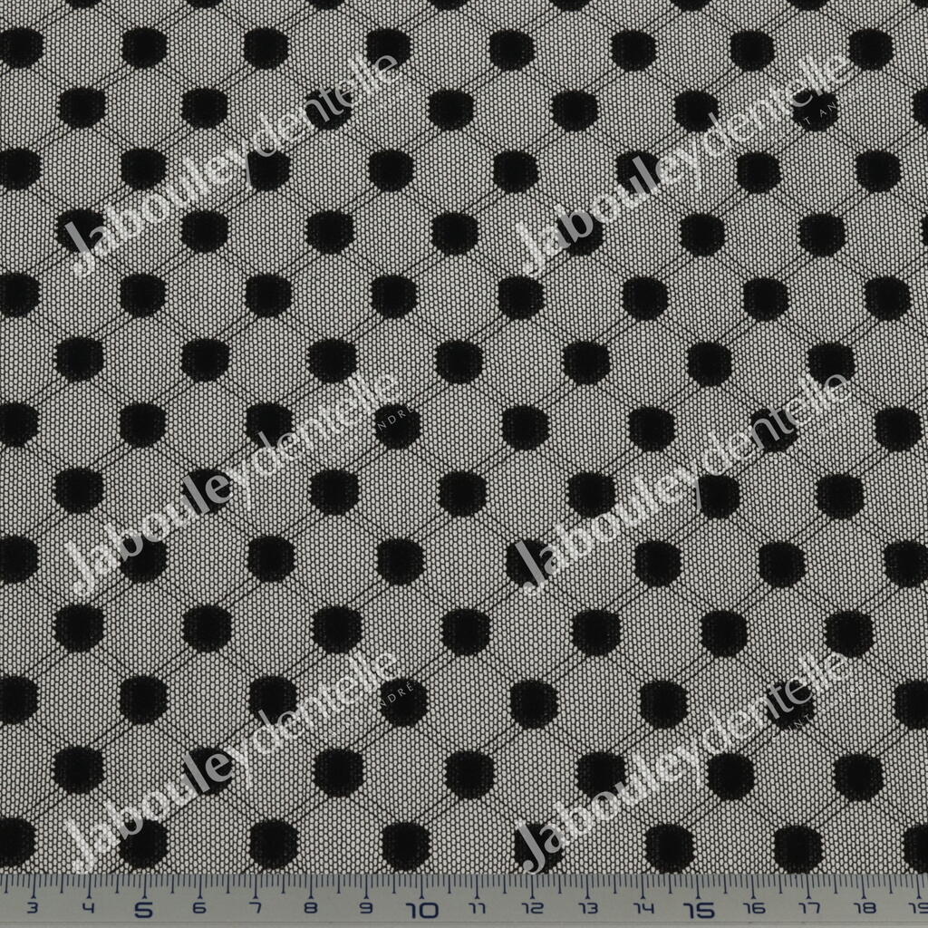 Dentelle Rachel en laize, élastique et fine, avec un assez gros motif plumetis sur fond tulle.