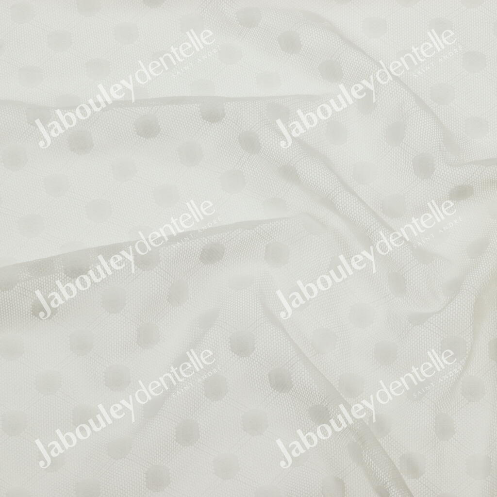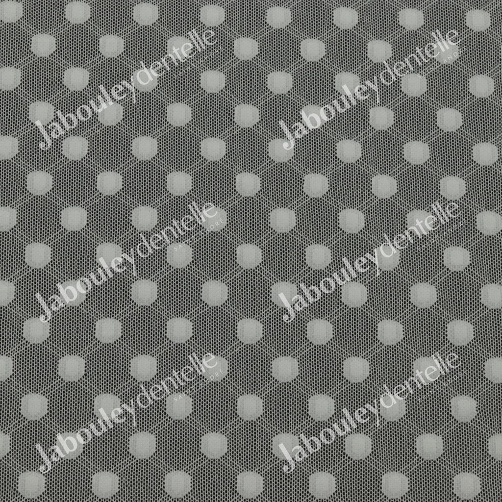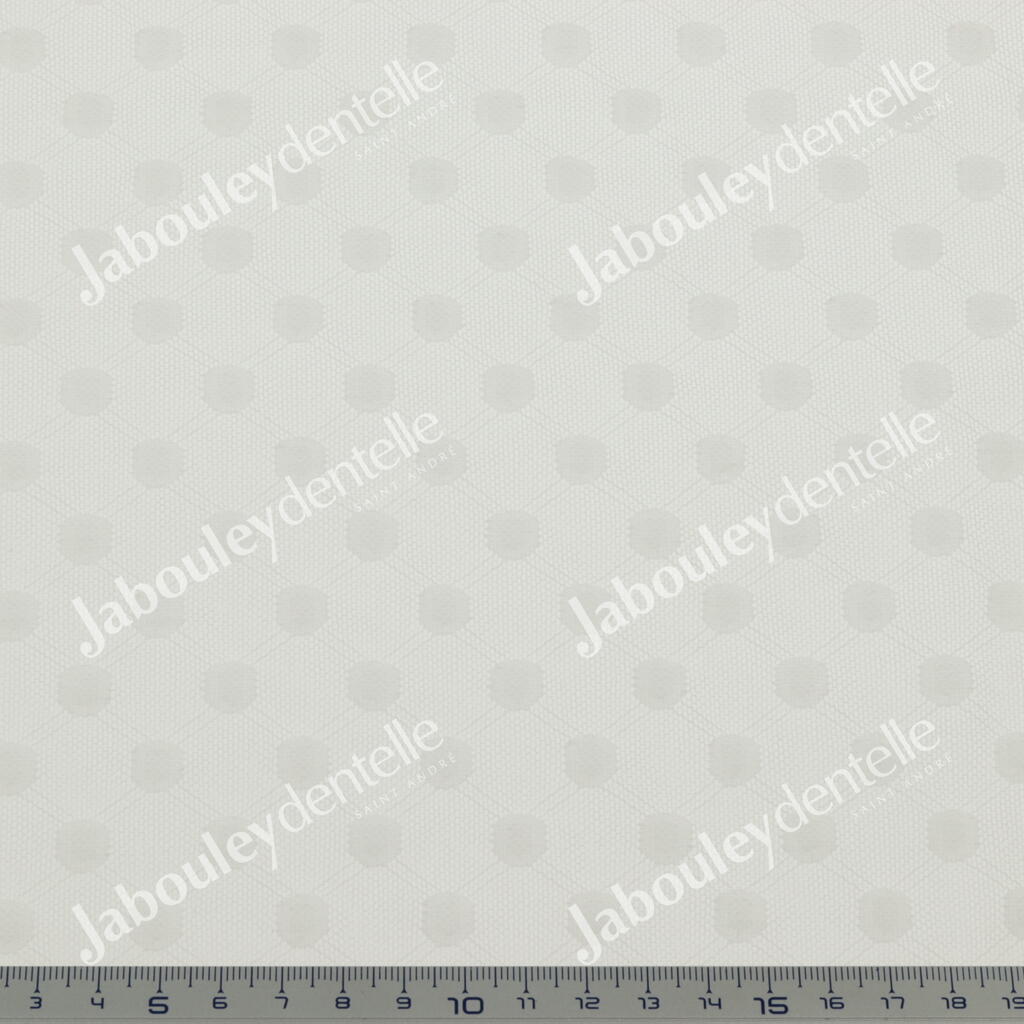 Dentelle Rachel en laize, élastique et fine, avec un assez gros motif plumetis sur fond tulle.
